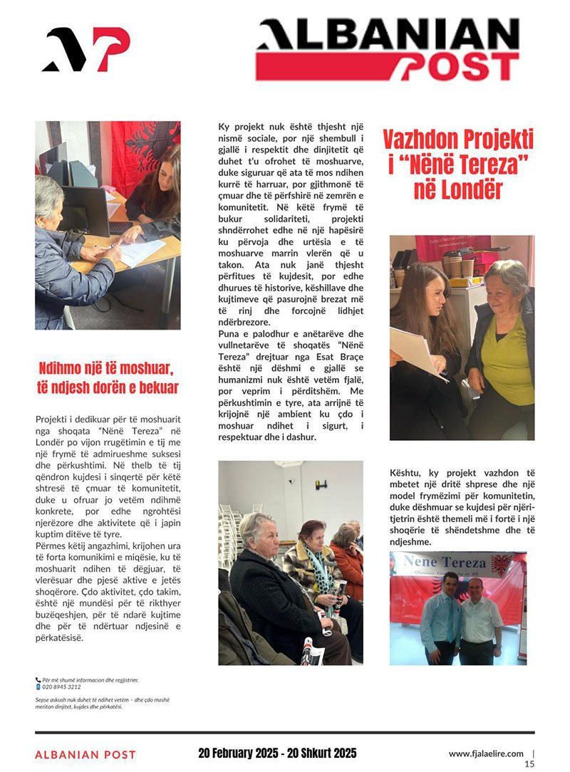 Projekti i dedikuar për të moshuarit nga shoqata “Nënë Tereza” në Londër po vijon rrugëtimin e tij me një frymë të admirueshme suksesi dhe përkushtimi. Në thelb të tij qëndron kujdesi i sinqertë për këtë shtresë të çmuar të komunitetit, duke u ofruar jo vetëm ndihmë konkrete, por edhe ngrohtësi njerëzore dhe aktivitete që i japin kuptim ditëve të tyre. Përmes këtij angazhimi, krijohen ura të forta komunikimi e miqësie, ku të moshuarit ndihen të dëgjuar, të vlerësuar dhe pjesë aktive e jetës shoqërore. Çdo aktivitet, çdo takim, është një mundësi për të rikthyer buzëqeshjen, për të ndarë kujtime dhe për të ndërtuar ndjesinë e përkatësisë.